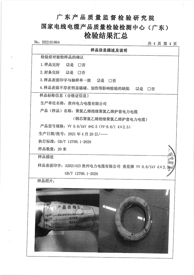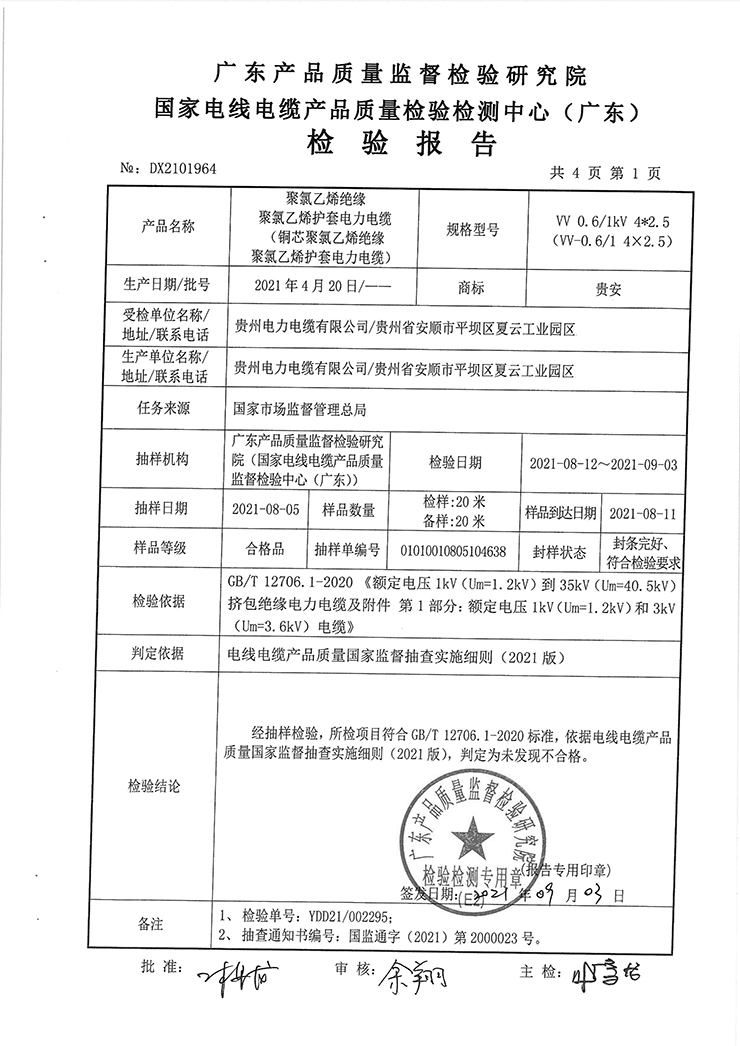 聚氯乙烯絕緣聚氯乙烯護(hù)套電力電纜(銅芯聚氯乙烯絕緣聚氯乙烯護(hù)套電力電纜)國(guó)抽檢驗(yàn)報(bào)告